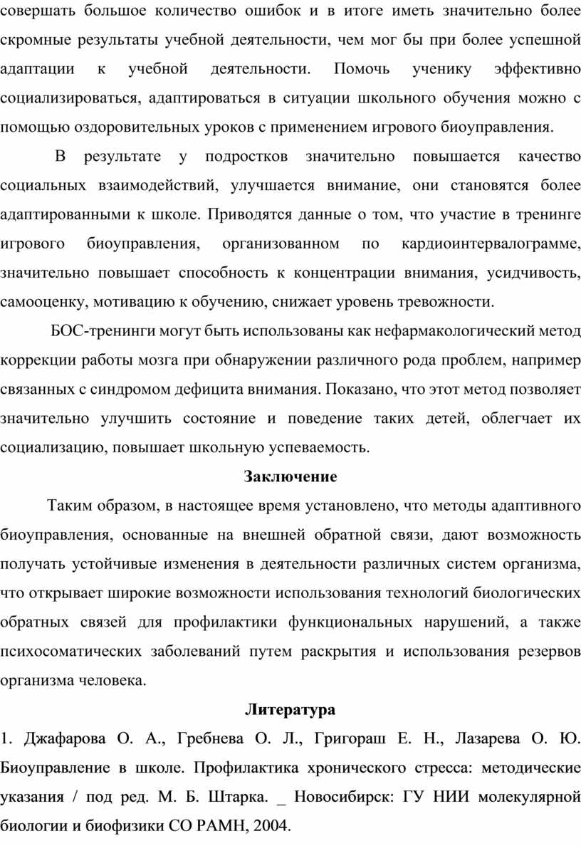 1. Джафарова О. А., Гребнева О. Л., Григораш Е. Н., Лазарева О. Ю. Биоуправление в школе. Профилактика хронического стресса: методические указания / под ред. М. Б. Штарка. _ Новосибирск: ГУ НИИ молекулярной биологии и биофизики СО РАМН, 2004.