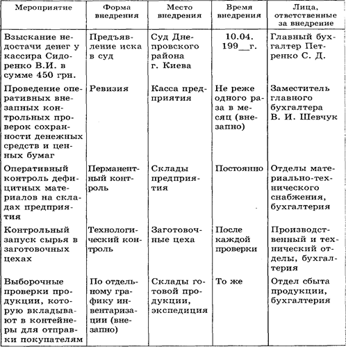 Руководство предприятия организовывает контроль за выполнением этих мероприятий и определяет их эффективность в сохранности ценностей. По каждому случаю недостачи денежных средств и материальных ценностей, выявленной в подотчете материально ответственных лиц или вследствие недопоставки предприятиями-поставщиками сырья и материалов, предъявляются исковые требования о возмещении ущерба соответственно правоохранительным органам, в государственный или ведомственный арбитраж.