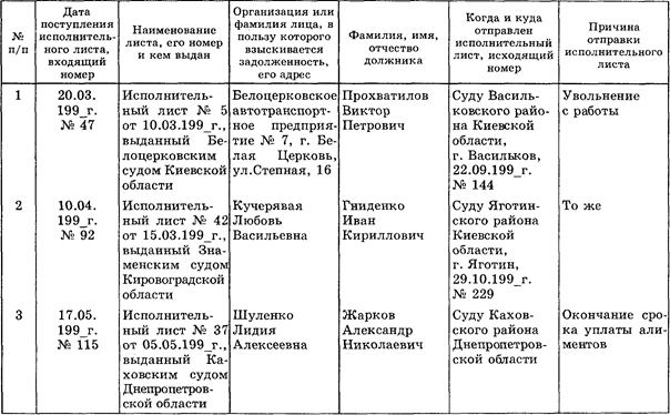 В возмещении причиненного ущерба предприятию, а также отдельным гражданам большое значение имеет хорошо налаженный учет исполнительных листов, выданных судами. Учет перемещения исполнительных листов на удержание задолженности ведется бухгалтерией в специальном журнале, форма которого показана в табл. 17.8.