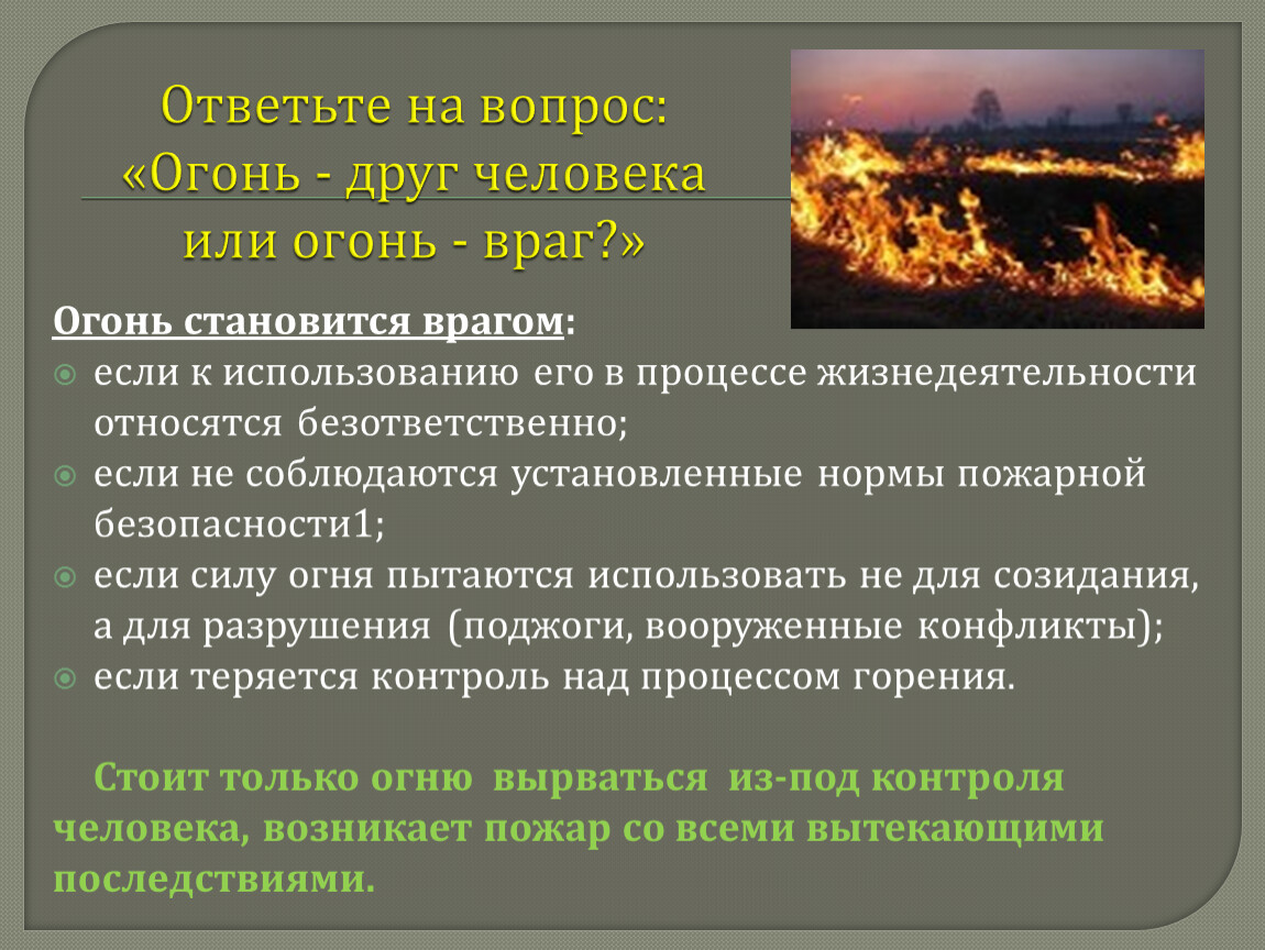 Ответьте на вопрос: «Огонь - друг человека или огонь - враг?»