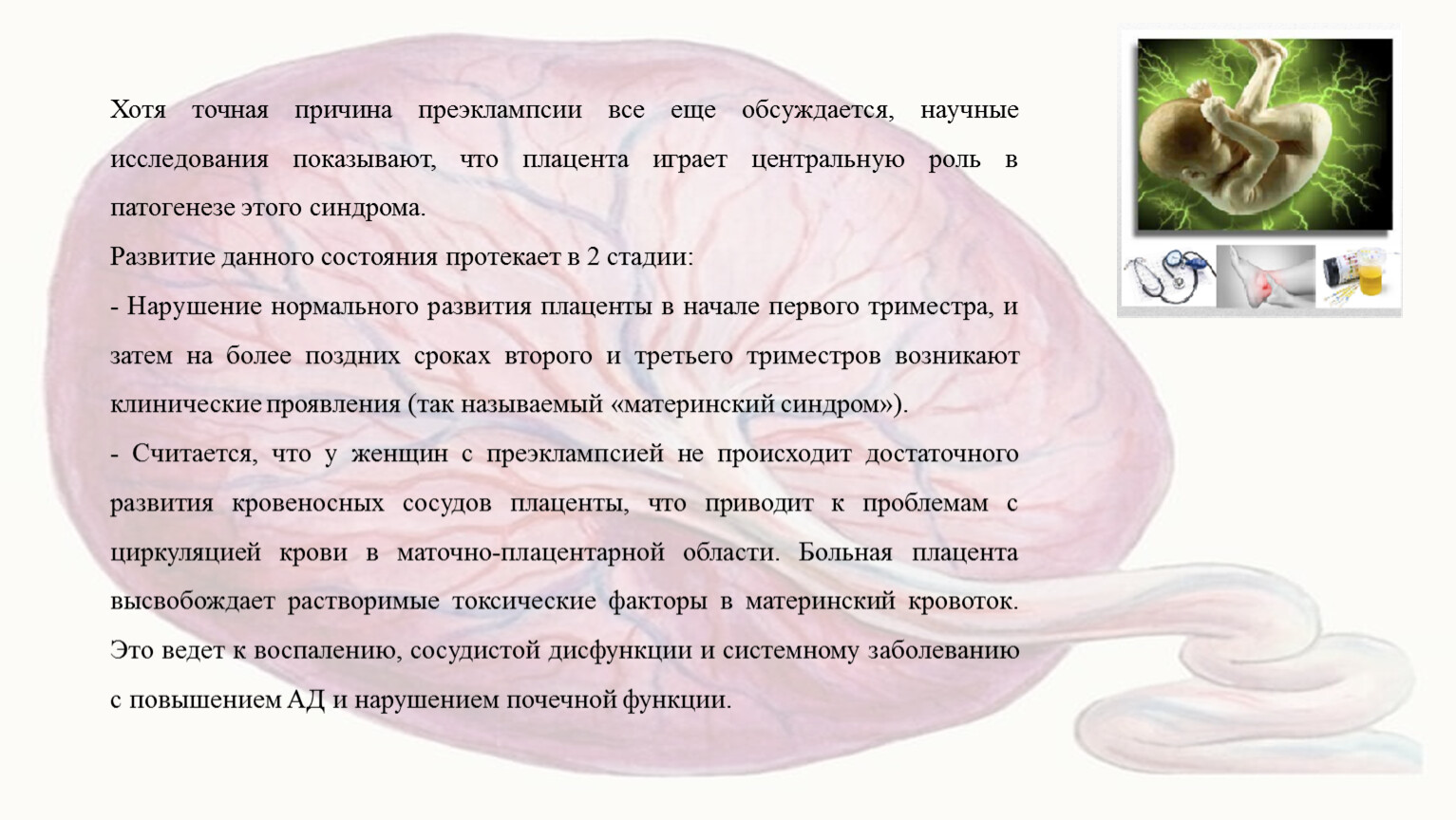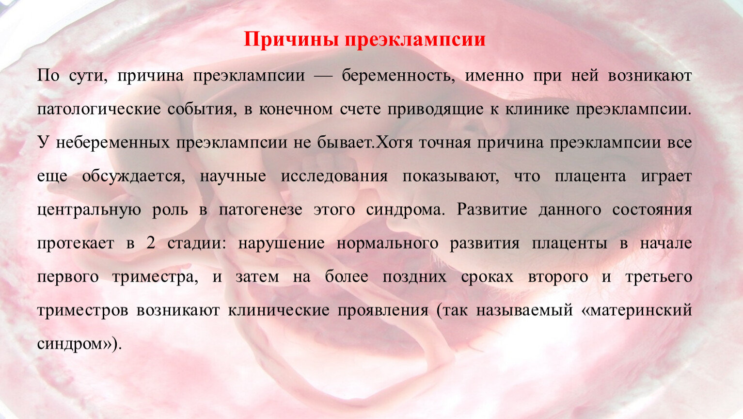 Хотя точная причина преэклампсии все еще обсуждается, научные исследования показывают, что плацента играет центральную роль в патогенезе этого синдрома.