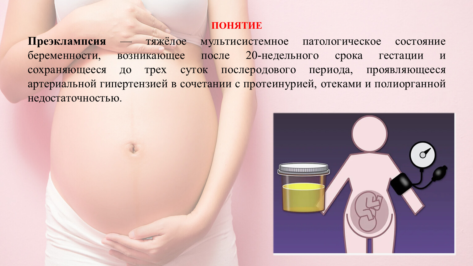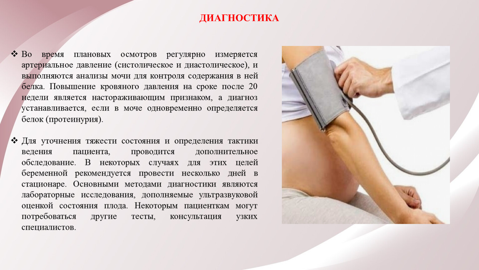 Во время плановых осмотров регулярно измеряется артериальное давление (систолическое и диастолическое), и выполняются анализы мочи для контроля содержания в ней белка. Повышение кровяного давления на сроке после 20 недели является настораживающим признаком, а диагноз устанавливается, если в моче одновременно определяется белок (протеинурия).