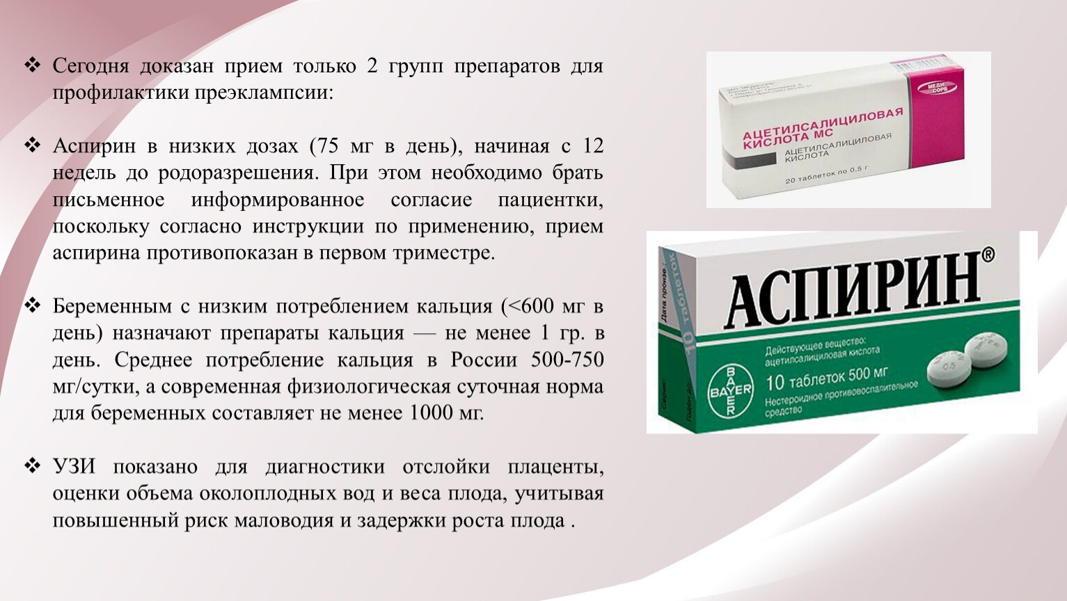 Сегодня доказан прием только 2 групп препаратов для профилактики преэклампсии: