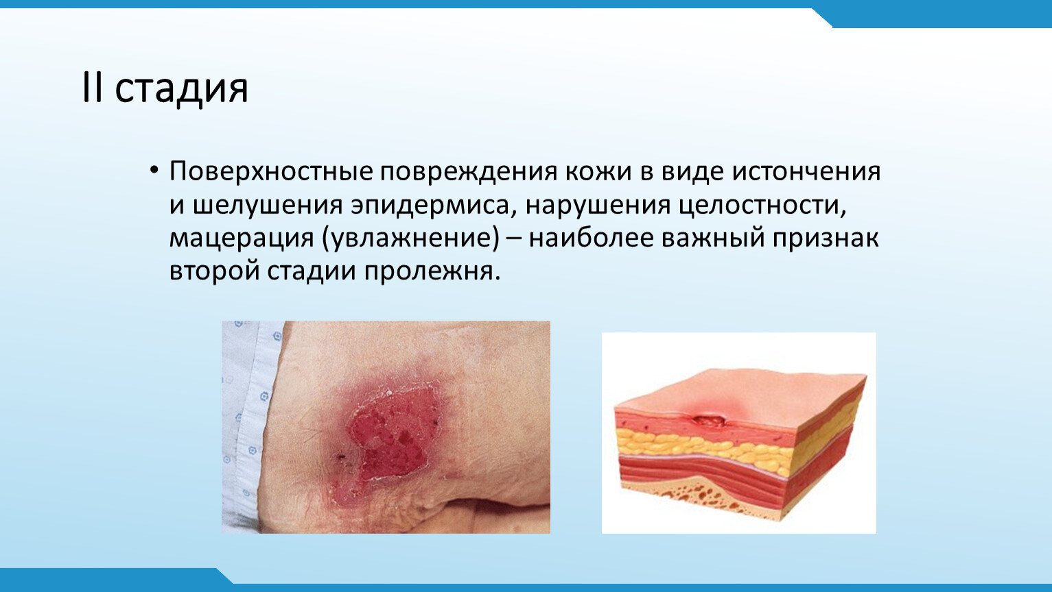 Поверхностные повреждения кожи в виде истончения и шелушения эпидермиса, нарушения целостности, мацерация (увлажнение) – наиболее важный признак второй стадии пролежня.