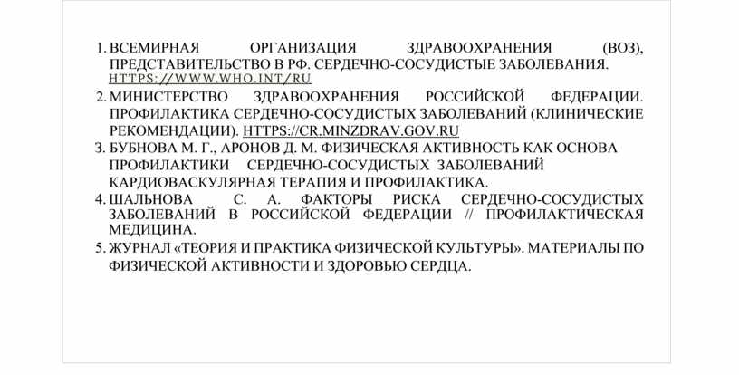 2. МИНИСТЕРСТВО ЗДРАВООХРАНЕНИЯ РОССИЙСКОЙ ФЕДЕРАЦИИ. ПРОФИЛАКТИКА СЕРДЕЧНО-СОСУДИСТЫХ ЗАБОЛЕВАНИЙ (КЛИНИЧЕСКИЕ РЕКОМЕНДАЦИИ). HTTPS://CR.MINZDRAV.GOV.RU З. БУБНОВА М. Г., АРОНОВ Д. М. ФИЗИЧЕСКАЯ АКТИВНОСТЬ КАК ОСНОВА ПРОФИЛАКТИКИ СЕРДЕЧНО-СОСУДИСТЫХ ЗАБОЛЕВАНИЙ КАРДИОВАСКУЛЯРНАЯ ТЕРАПИЯ И ПРОФИЛАКТИКА. 4. ШАЛЬНОВА 5. ЖУРНАЛ «ТЕОРИЯ И ПРАКТИКА ФИЗИЧЕСКОЙ КУЛЬТУРЫ». МАТЕРИАЛЫ ПО ФИЗИЧЕСКОЙ АКТИВНОСТИ И ЗДОРОВЬЮ СЕРДЦА. |