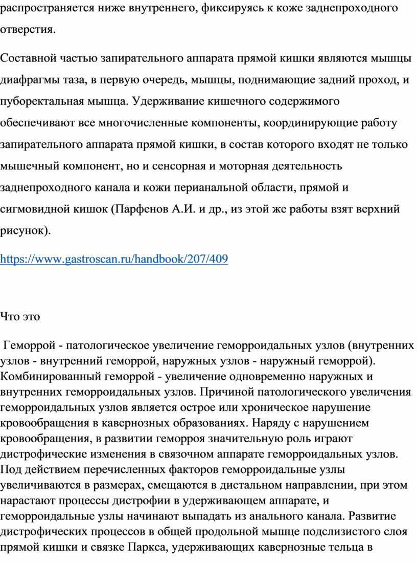 Геморрой - патологическое увеличение геморроидальных узлов (внутренних узлов - внутренний геморрой, наружных узлов - наружный геморрой). Комбинированный геморрой - увеличение одновременно наружных и внутренних геморроидальных узлов. Причиной патологического увеличения геморроидальных узлов является острое или хроническое нарушение кровообращения в кавернозных образованиях. Наряду с нарушением кровообращения, в развитии геморроя значительную роль играют дистрофические изменения в связочном аппарате геморроидальных узлов. Под действием перечисленных факторов геморроидальные узлы увеличиваются в размерах, смещаются в дистальном направлении, при этом нарастают процессы дистрофии в удерживающем аппарате, и геморроидальные узлы начинают выпадать из анального канала. Развитие дистрофических процессов в общей продольной мышце подслизистого слоя прямой кишки и связке Паркса, удерживающих кавернозные тельца в анальном канале, приводит к постепенному, но необратимому смещению геморроидальных узлов в дистальном направлении