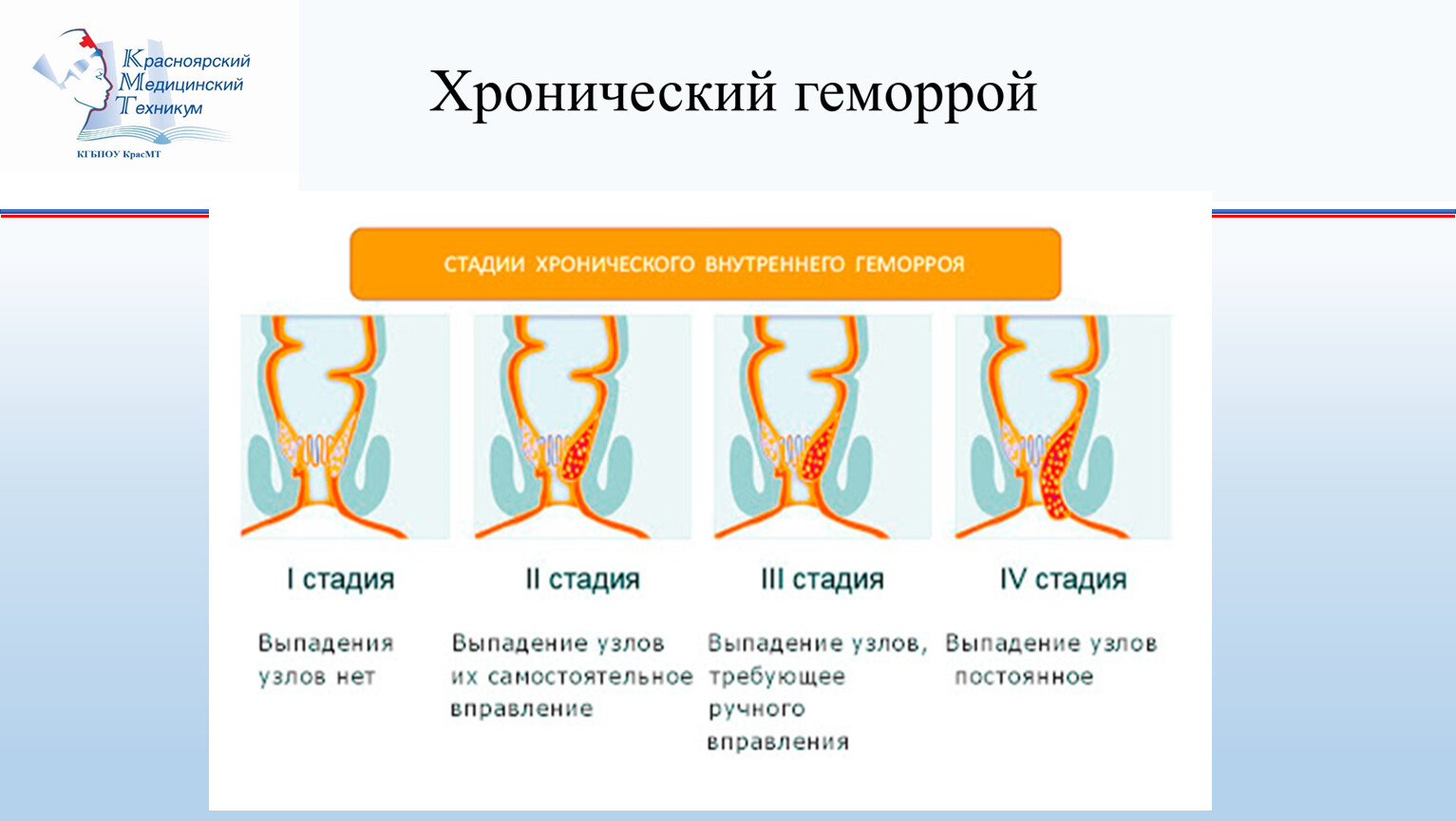 4 стадия - постоянное выпадение (с кровотечением и без него) даже при незначительных нагрузках (кашель, смех и другое), невозможность их вправления в анальный канал.