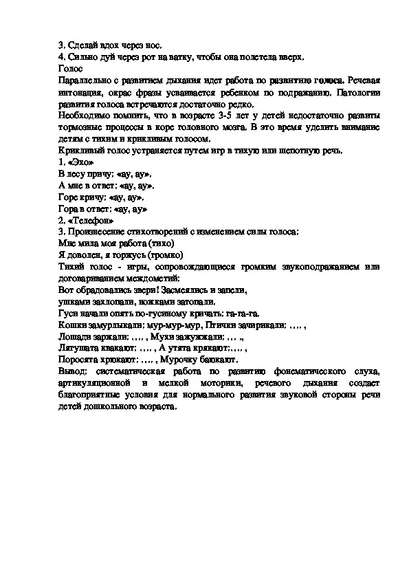 Параллельно с развитием дыхания идет работа по развитию голоса. Речевая