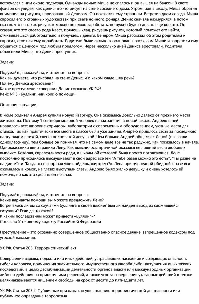 В работе с кейсами предлагается проработать три темы, особенно актуальные сегодня: телефонный терроризм, незаконный оборот психотропных веществ, наркотических препаратов и их аналогов, буллинг.