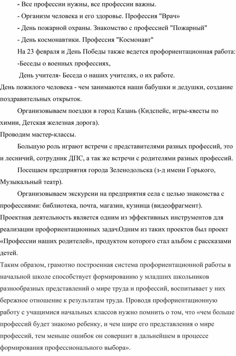 Таким образом, грамотно построенная система профориентационной работы в начальной школе способствует формированию у младших школьников разнообразных представлений о мире труда и профессий, воспитывает у них бережное отношение к результатам труда. Проводя профориентационную работу с учащимися начальных классов нужно помнить о том, что «чем больше профессий будет знакомо ребенку, и чем шире его представления о мире профессий, тем меньше ошибок он совершит в дальнейшем в процессе формирования профессионального выбора».
