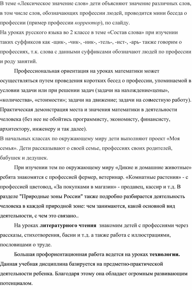На уроках русского языка во 2 классе в теме «Состав слова» при изучении таких суффиксов как -щик-, -чик-, -ник-, -тель-, -ист-, -арь- также говорим о профессиях, т.к. слова с данными суффиксами обозначают людей по профессии и роду занятий.