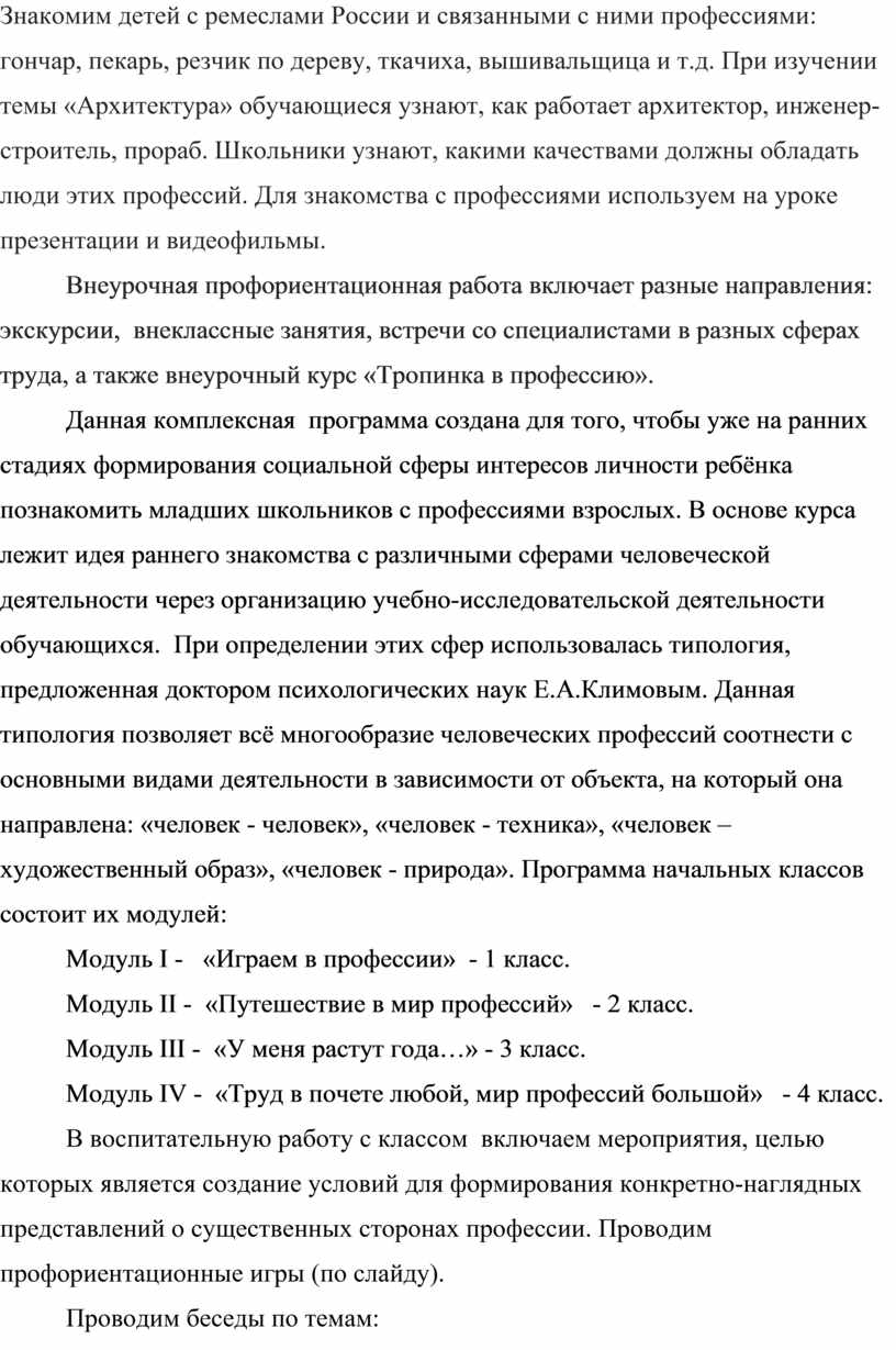 Данная комплексная программа создана для того, чтобы уже на ранних стадиях формирования социальной сферы интересов личности ребёнка познакомить младших школьников с профессиями взрослых. В основе курса лежит идея раннего знакомства с различными сферами человеческой деятельности через организацию учебно-исследовательской деятельности обучающихся. При определении этих сфер использовалась типология, предложенная доктором психологических наук Е.А.Климовым. Данная типология позволяет всё многообразие человеческих профессий соотнести с основными видами деятельности в зависимости от объекта, на который она направлена: «человек - человек», «человек - техника», «человек – художественный образ», «человек - природа». Программа начальных классов состоит их модулей: