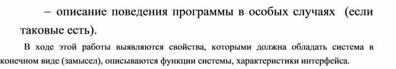 В ходе этой работы выявляются свойства, которыми должна обладать система в конечном виде (замысел), описываются функции системы, характеристики интерфейса.
