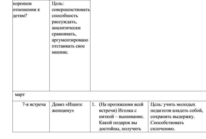 Цель: развивать творческие возможности. Совершенствовать коллективные умения. Выявить нравственные эталоны у молодых педагогов. Развивать адекватную самооценку у педагогов. |