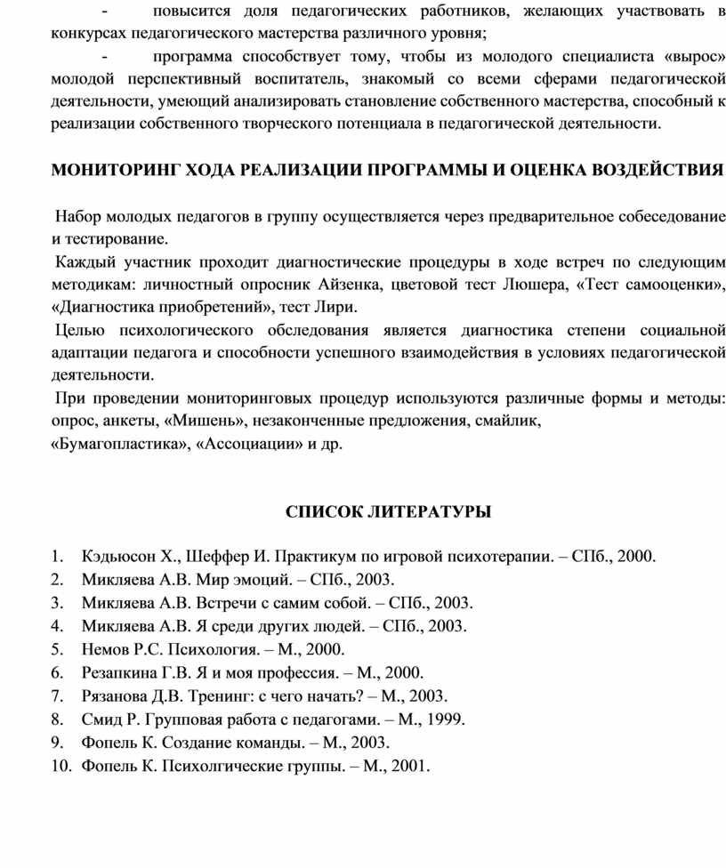- программа способствует тому, чтобы из молодого специалиста «вырос» молодой перспективный воспитатель, знакомый со всеми сферами педагогической деятельности, умеющий анализировать становление собственного мастерства, способный к реализации собственного творческого потенциала в педагогической деятельности.