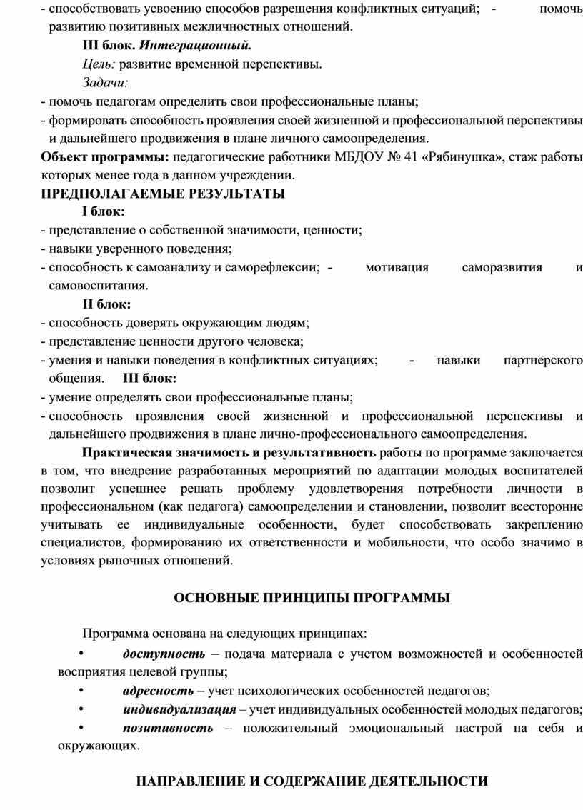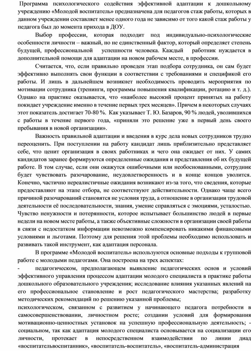 - психологическом, связанном с развитием у начинающего педагога потребности в самосовершенствовании, личностном росте; создании условий для формирования мотивационно-ценностных установок на успешную профессиональную деятельность; - социальном, так как адаптация молодого специалиста основывается на социализации его личности, протекает в непосредственном взаимодействии по линии диад «воспитательвоспитанник», «воспитатель-воспитатель», «воспитатель-администрация дошкольного образовательного учреждения», «воспитатель-психолог», «воспитатель-родители воспитанника».