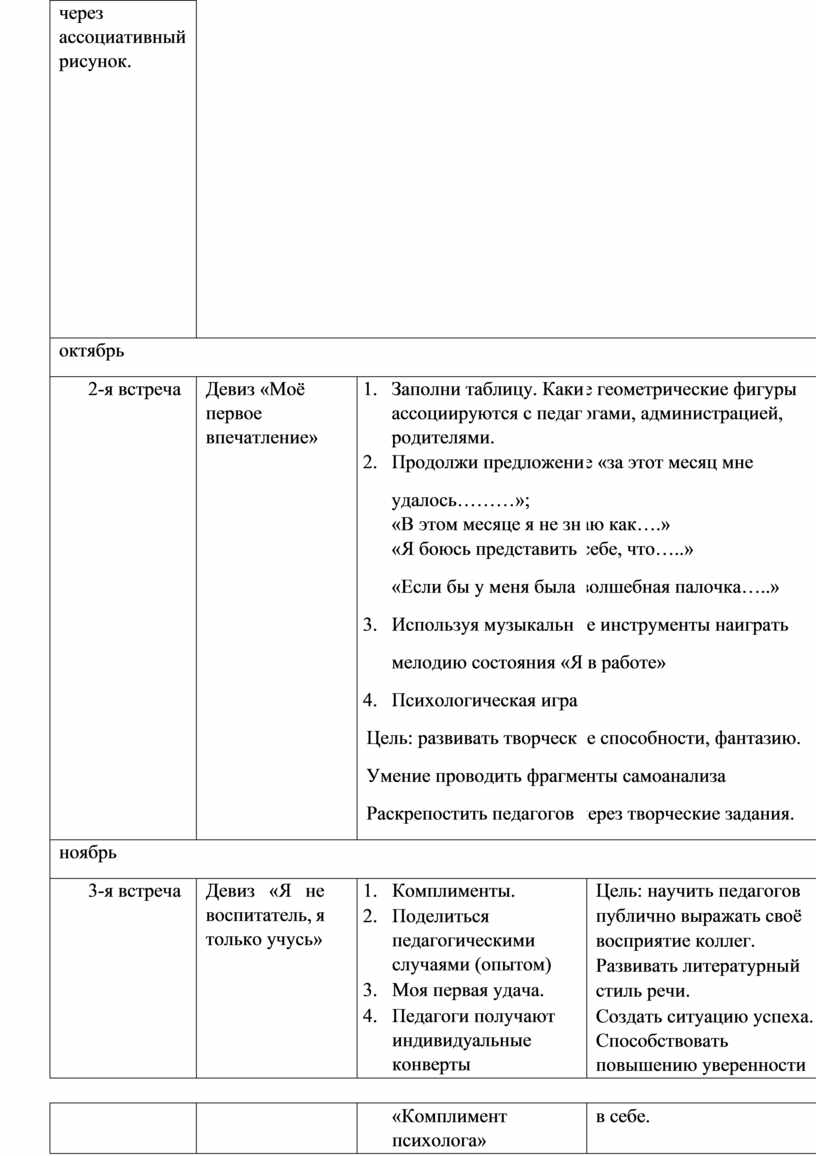 При проведении психологических встреч с педагогами используются следующие формы работы: мозговые штурмы, дискуссии, работа с изобразительными средствами, упражнения и игры на создание положительного образа «Я», ролевые игры, анализ типичных ситуаций, психогимнастика, психодрама.