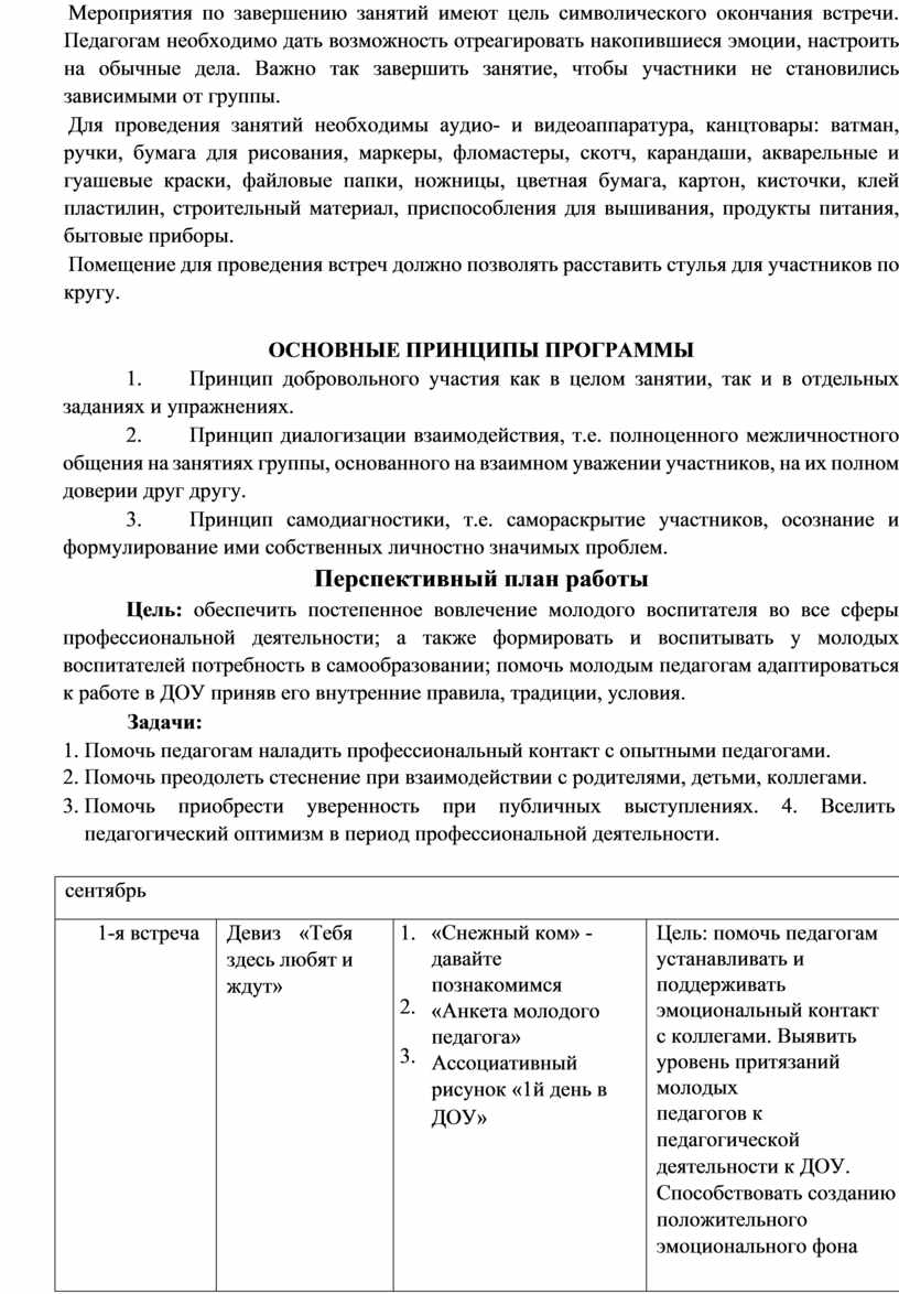 Цель: обеспечить постепенное вовлечение молодого воспитателя во все сферы профессиональной деятельности; а также формировать и воспитывать у молодых воспитателей потребность в самообразовании; помочь молодым педагогам адаптироваться к работе в ДОУ приняв его внутренние правила, традиции, условия.