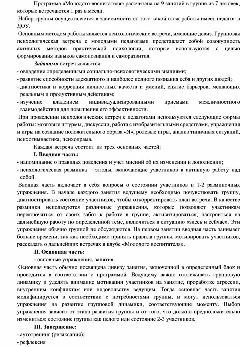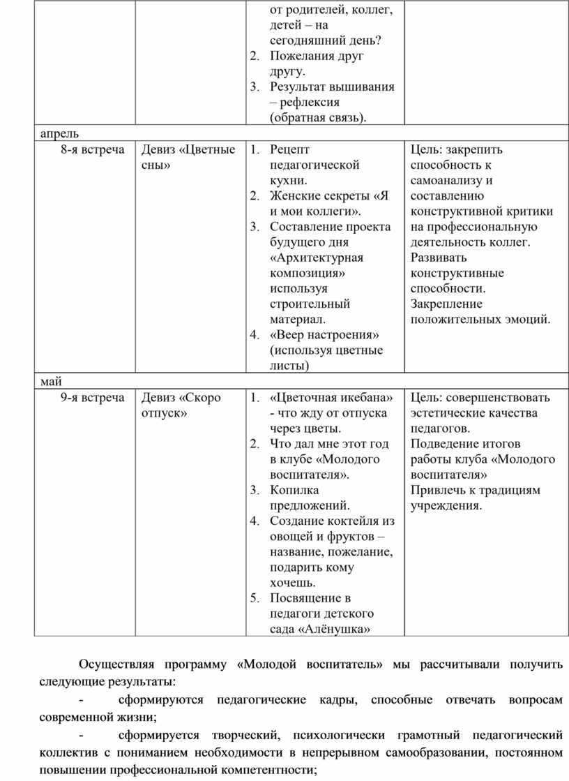 Программа «Молодого воспитателя» рассчитана на 9 занятий в группе из 7 человек, которые встречаются 1 раз в месяц.