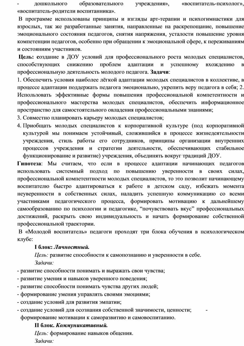 Гипотеза: Мы считаем, что если в процессе адаптации начинающих педагогов использовать системный подход по повышению уверенности в своих силах, профессиональной компетентности молодых специалистов, то это позволит начинающему воспитателю быстро адаптироваться к работе в детском саду, избежать момента неуверенности в собственных силах, наладить успешную коммуникацию со всеми участниками педагогического процесса, формировать мотивацию к дальнейшему самообразованию по психологии и педагогике, “почувствовать вкус” профессиональных достижений, раскрыть свою индивидуальность и начать формирование собственной профессиональной траектории.