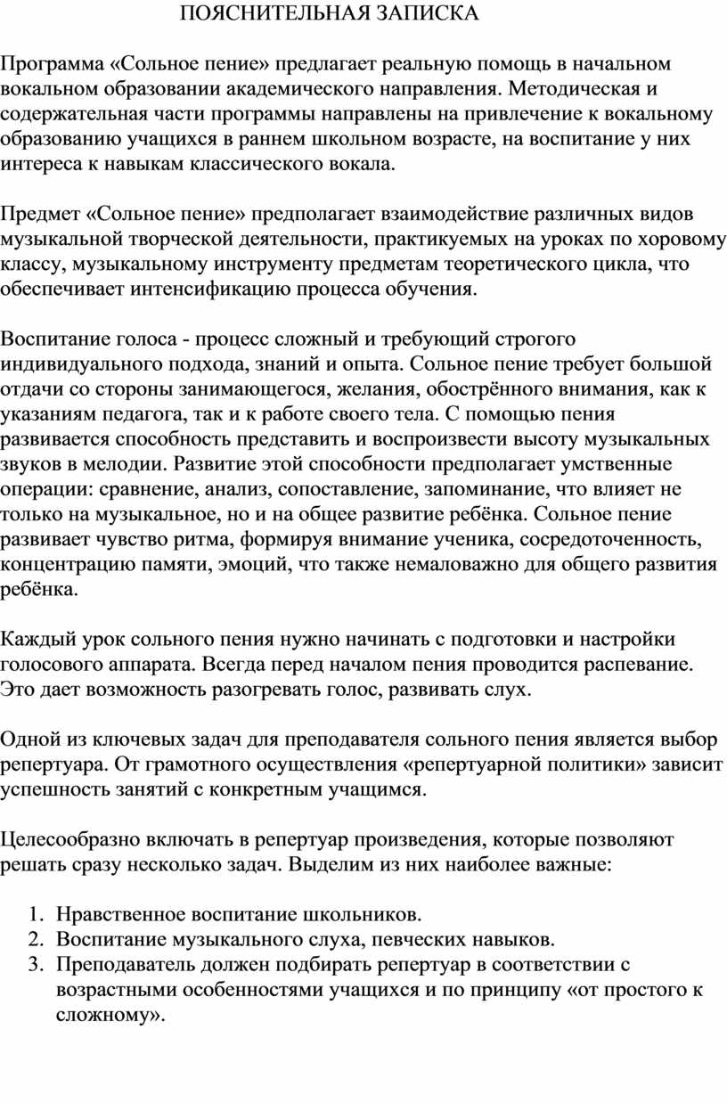 Программа «Сольное пение» предлагает реальную помощь в начальном вокальном образовании академического направления. Методическая и содержательная части программы направлены на привлечение к вокальному образованию учащихся в раннем школьном возрасте, на воспитание у них интереса к навыкам классического вокала.