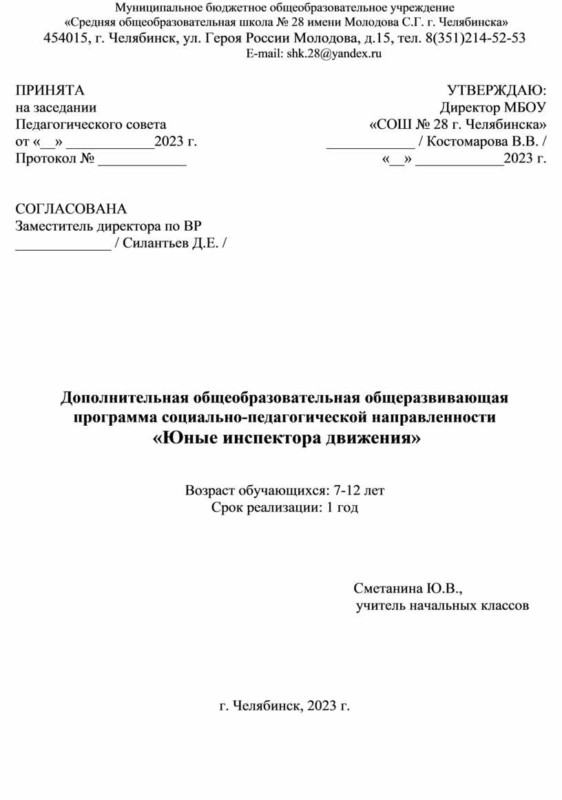 УТВЕРЖДАЮ: Директор МБОУ «СОШ № 28 г. Челябинска» ____________ / Костомарова В.В. / «__» ____________2023 г. |