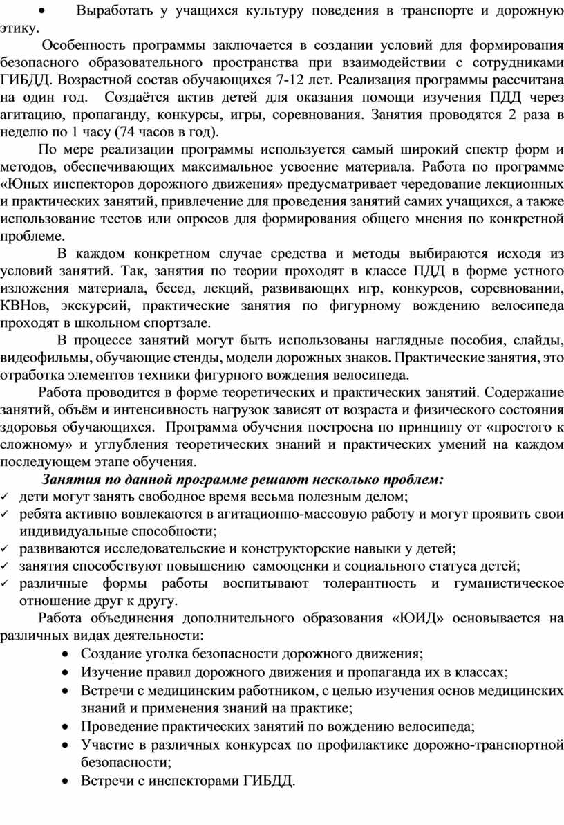 Программа кружка «Юные инспектора дорожного движения» (ЮИД) разработана в рамках Федерального закона «О безопасности дорожного движения», закона Российской Федерации «О безопасности», «Правил безопасного поведения учащихся на улицах и дорогах» и реализует программу дополнительного образования социально-педагогической направленности.