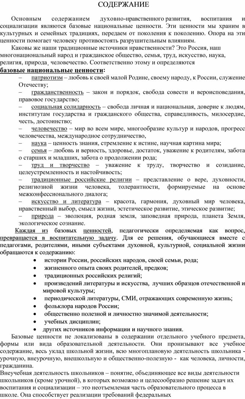 Базовые ценности не локализованы в содержании отдельного учебного предмета, формы или вида образовательной деятельности. Они пронизывают все учебное содержание, весь уклад школьной жизни, всю многоплановую деятельность школьника -урочную, внеурочную, внешкольную и общественно-полезную - как человека, личности, гражданина.