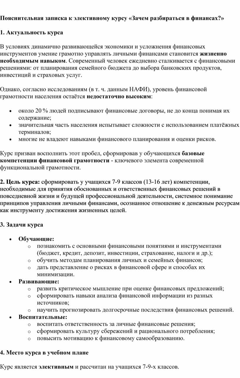 записка к элективному курсу «Зачем разбираться в финансах?»
