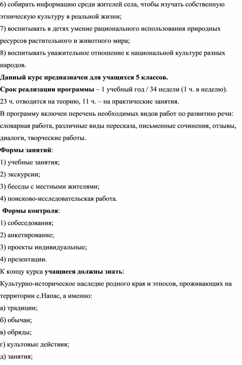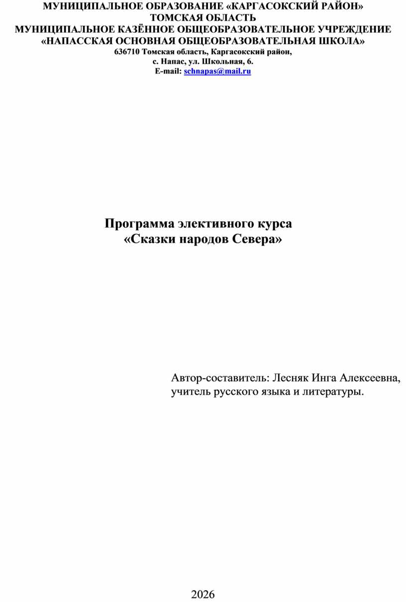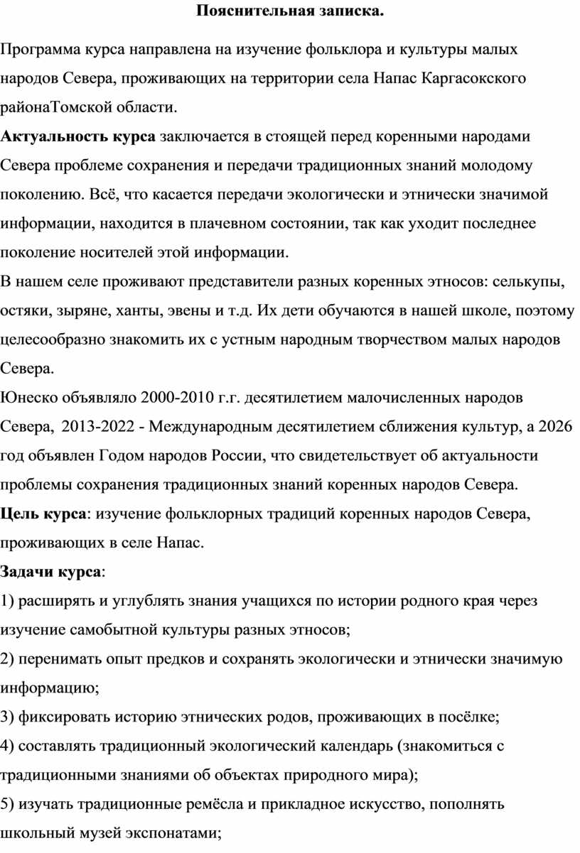 Программа курса направлена на изучение фольклора и культуры малых народов Севера, проживающих на территории села Напас Каргасокского районаТомской области.