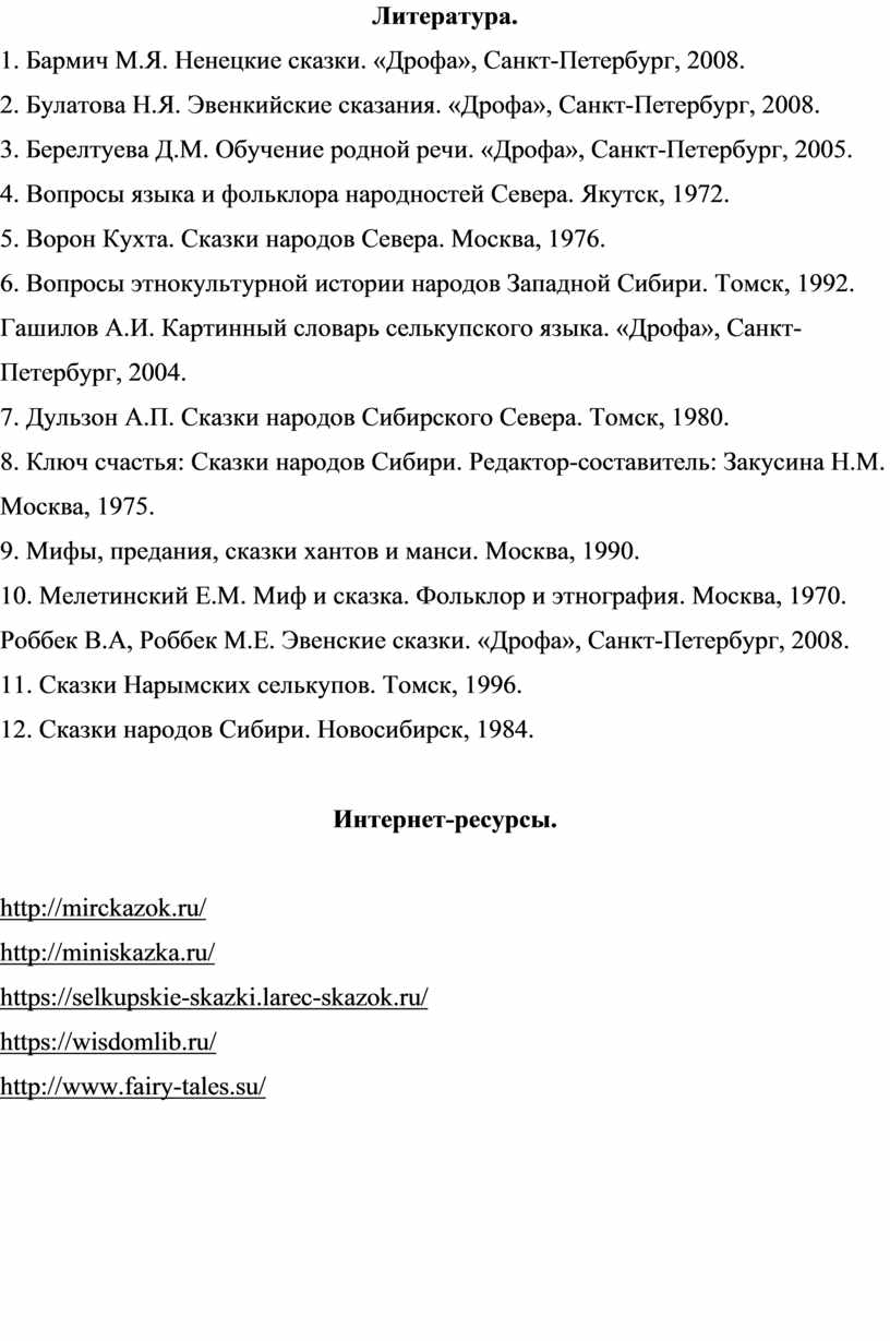1. Бармич М.Я. Ненецкие сказки. «Дрофа», Санкт-Петербург, 2008.