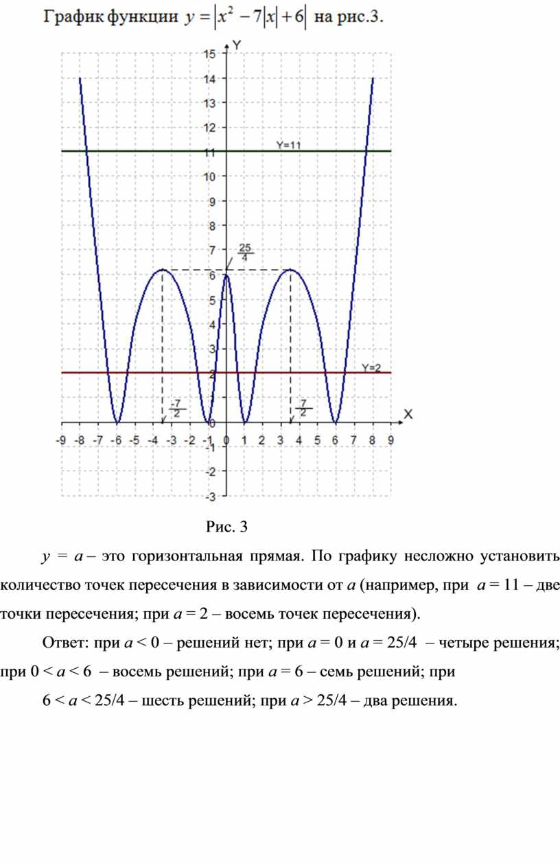 y = a – это горизонтальная прямая. По графику несложно установить количество точек пересечения в зависимости от a (например, при a = 11 – две точки пересечения; при a = 2 – восемь точек пересечения).