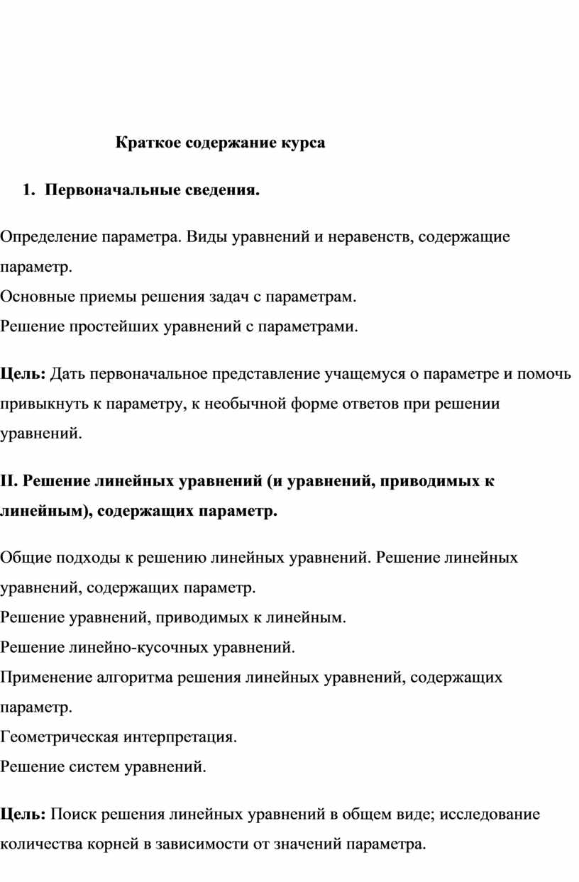 Цель: Дать первоначальное представление учащемуся о параметре и помочь привыкнуть к параметру, к необычной форме ответов при решении уравнений.