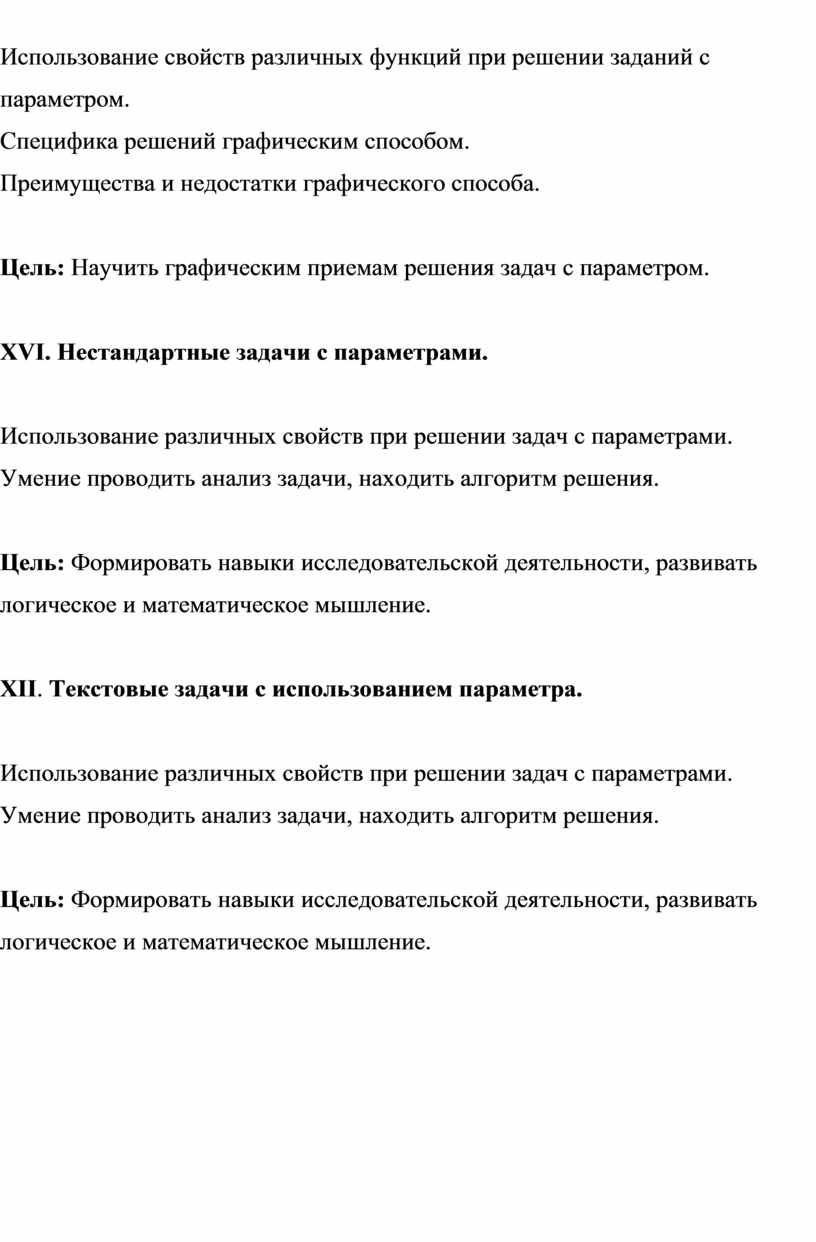 Целью профильного обучения, как одного из направлений модернизации математического образования является обеспечение углубленного изучения предмета и подготовка учащихся к продолжению образования. Основным направлением модернизации математического школьного образования является отработка механизмов итоговой аттестации через введение единого государственного экзамена. Появление таких заданий на экзаменах далеко не случайно, т.к. с их помощью проверяется техника владения формулами элементарной математики, методами решения уравнений и неравенств, умение выстраивать логическую цепочку рассуждений, уровень логического мышления учащегося и их математической культуры. Решению задач с параметрами в школьной программе уделяется мало внимания. Большинство учащихся либо вовсе не справляются с такими задачами, либо приводят громоздкие выкладки. Причиной этого является отсутствие системы заданий по данной теме в школьных учебниках. В связи с этим возникла необходимость в разработке и проведении элективного курса для старшеклассников по теме: «Решение задач с параметрами». Многообразие задач с параметрами охватывает весь курс школьной математики. Владение приемами решения задач с параметрами можно считать критерием знаний основных разделов школьной математики, уровня математического и логического мышления. Задачи с параметрами дают прекрасный материал для настоящей учебно-исследовательской работы.
