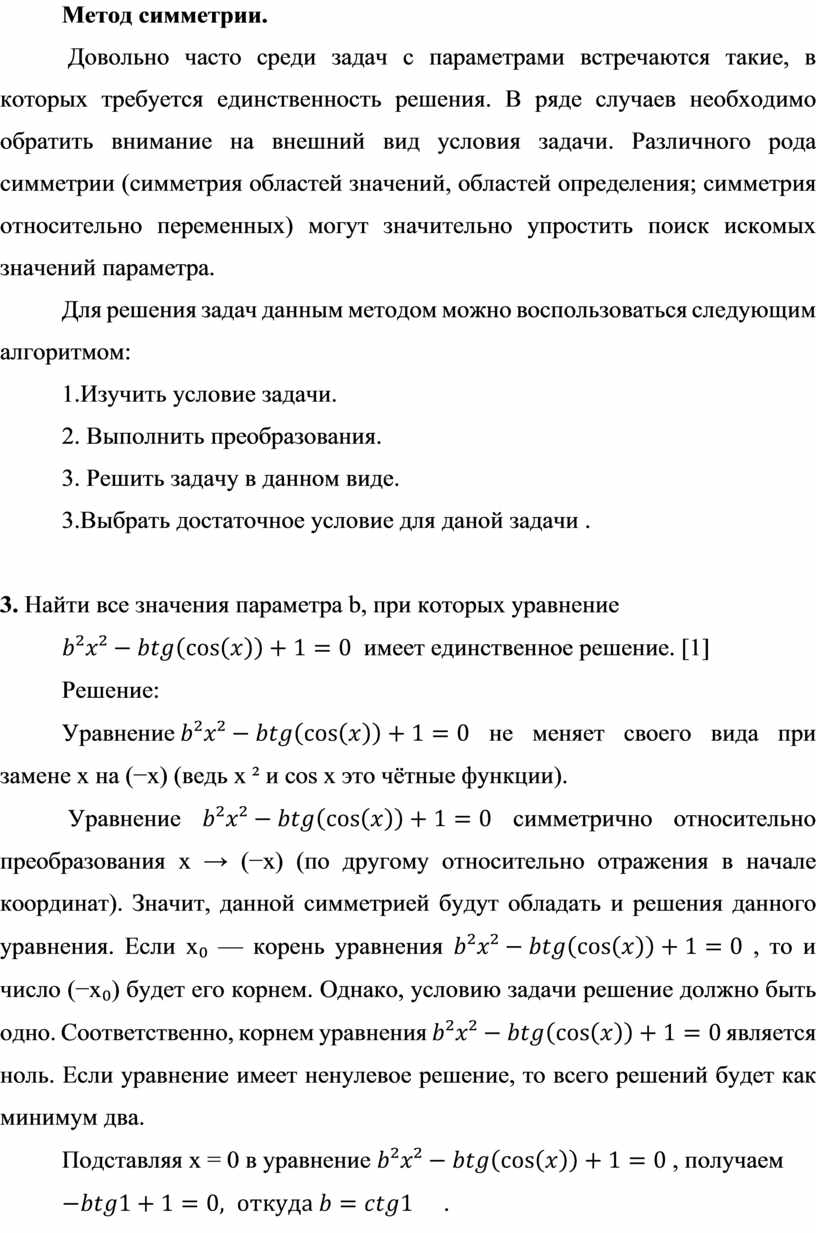 Довольно часто среди задач с параметрами встречаются такие, в которых требуется единственность решения. В ряде случаев необходимо обратить внимание на внешний вид условия задачи. Различного рода симметрии (симметрия областей значений, областей определения; симметрия относительно переменных) могут значительно упростить поиск искомых значений параметра.