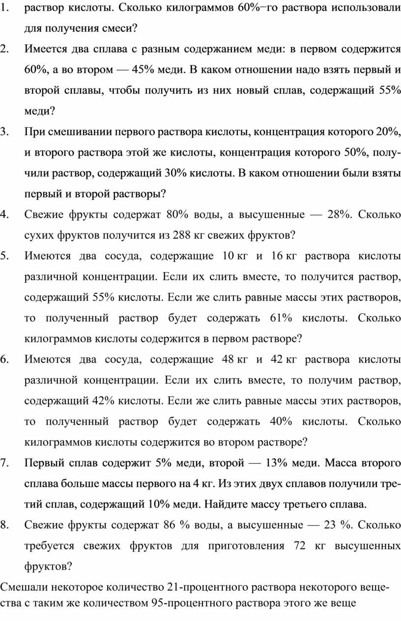 8. Свежие фрукты содержат 86 % воды, а высушенные — 23 %. Сколько требуется свежих фруктов для приготовления 72 кг высушенных фруктов?