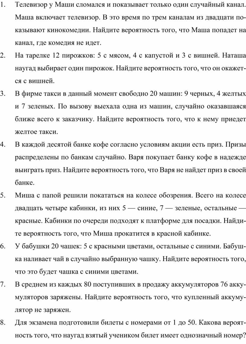 1. Телевизор у Маши сломался и показывает только один случайный канал. Маша включает телевизор. В это время по трем каналам из двадцати показывают кинокомедии. Найдите вероятность того, что Маша попадет на канал, где комедия не идет.