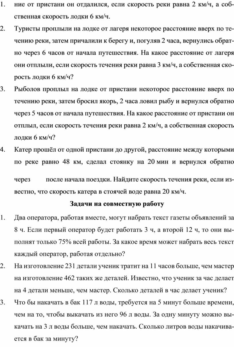 7. Рыболов в 5 часов утра на моторной лодке отправился от пристани против течения реки, через некоторое время бросил якорь, 2 часа ловил рыбу и вернулся обратно в 10 часов утра того же дня. На какое расстояние от пристани он отдалился, если скорость реки равна 2 км/ч, а собственная скорость лодки 6 км/ч.