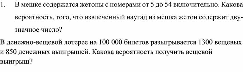 9. В мешке содержатся жетоны с номерами от 5 до 54 включительно. Какова вероятность, того, что извлеченный наугад из мешка жетон содержит двузначное число?