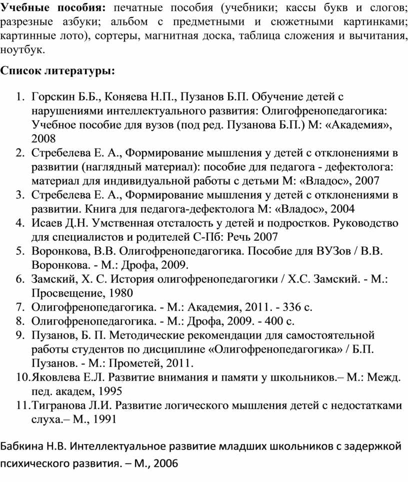 1. Горскин Б.Б., Коняева Н.П., Пузанов Б.П. Обучение детей с нарушениями интеллектуального развития: Олигофренопедагогика: Учебное пособие для вузов (под ред. Пузанова Б.П.) М: «Академия», 2008