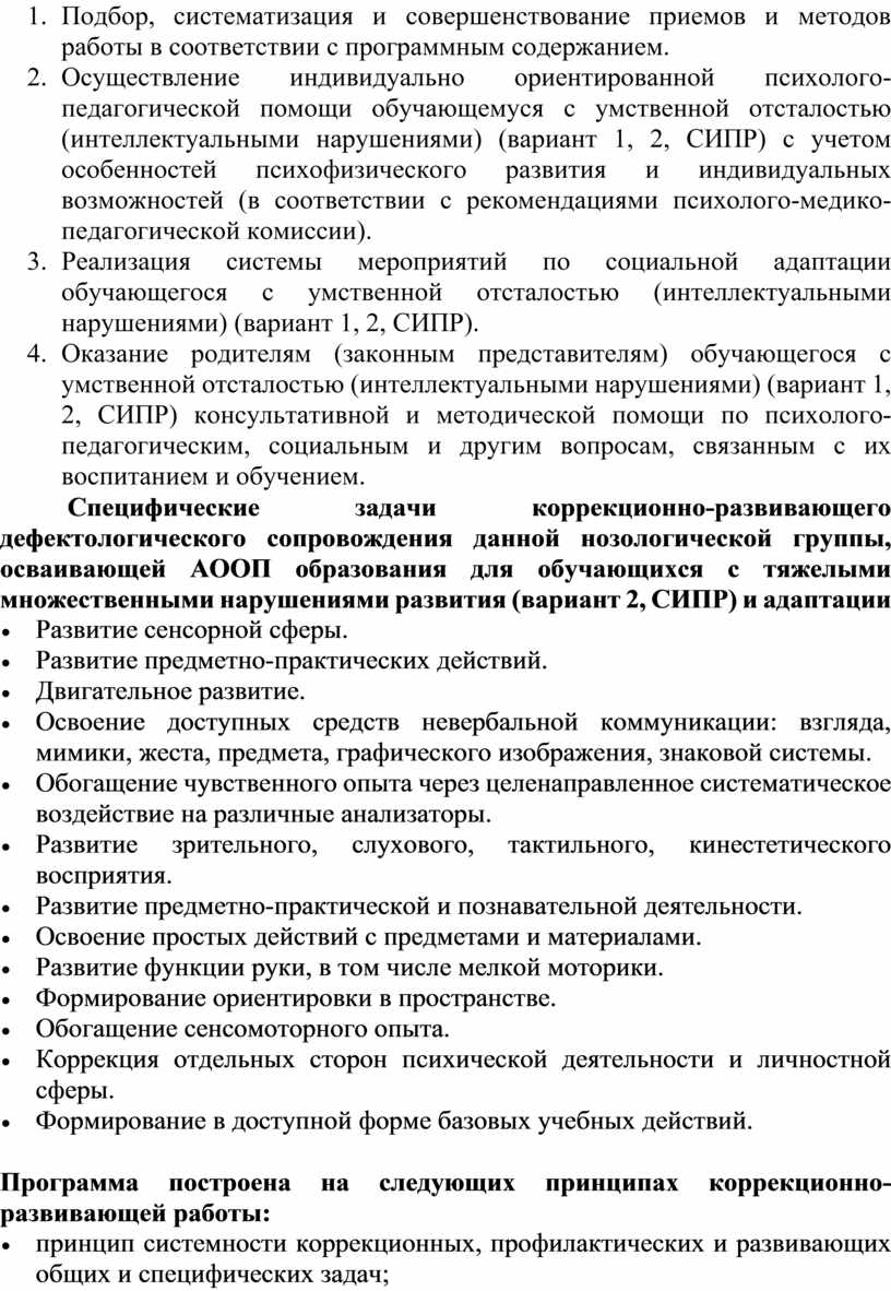 Рабочая программа учителя-дефектолога является обязательным документом, обеспечивающим реализацию коррекционно-развивающей деятельности в рамках освоения адаптированной основной общеобразовательной программы, составленной для обучающихся с умственной отсталостью (интеллектуальными нарушениями) (вариант 2, СИПР)