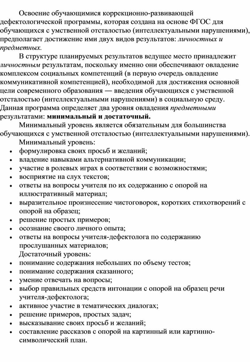Минимальный уровень является обязательным для большинства обучающихся с умственной отсталостью (интеллектуальными нарушениями).