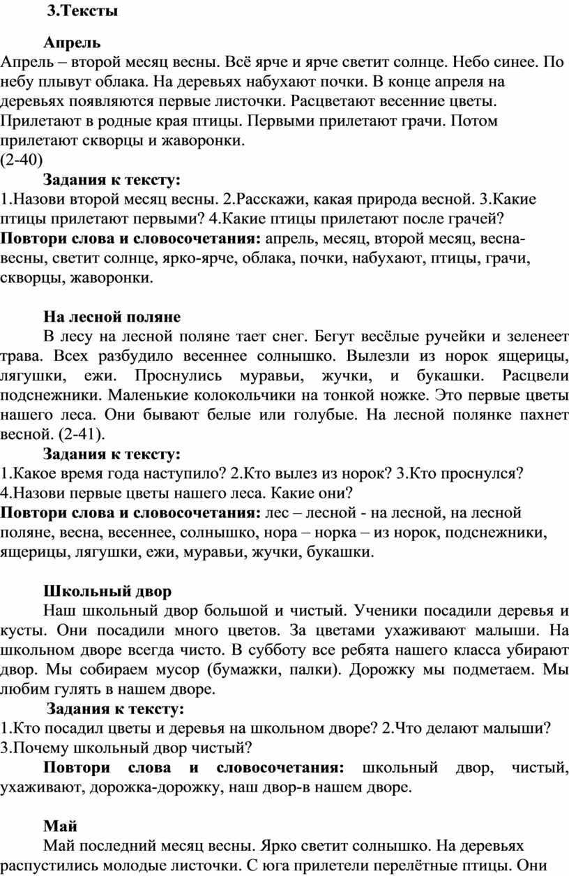 Более сложный по содержанию и больший по объему материал предлагается учащимся с более высоким уровнем речевого развития. В зависимости от речевого развития учащегося учитель при необходимости может заменить отдельные слова, фразы, упростить тексты, не изменяя при этом типа фраз, объема предлагаемого речевого материала.
