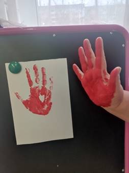 Воспитатель: Давайте с вами потренируемся, как будто краска стоит возле нас. Обмакиваем ладошку в краску, прикладываем к листу бумаги. Еще раз попробуем(2-ой раз) обмакиваем в краску и прикладываем.