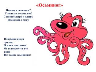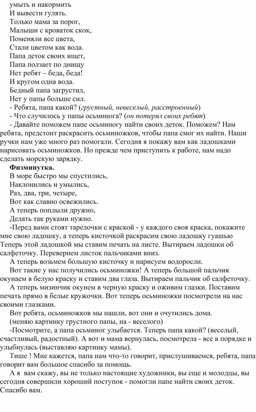 - Давайте поможем папе осьминогу найти своих деток. Поможем? Нам ребята, предстоит раскрасить осьминожков, чтобы папа смог их найти. Наши ручки нам уже много раз помогали. Сегодня я покажу вам как ладошками нарисовать осьминожков. Но прежде чем приступить к работе, нам надо сделать морскую зарядку.