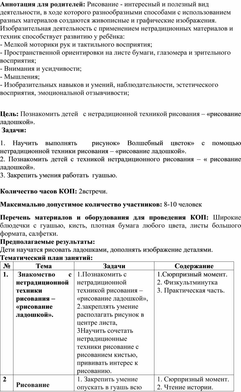 Аннотация для родителей: Рисование - интересный и полезный вид деятельности, в ходе которого разнообразными способами с использованием разных материалов создаются живописные и графические изображения. Изобразительная деятельность с применением нетрадиционных материалов и техник способствует развитию у ребёнка:
