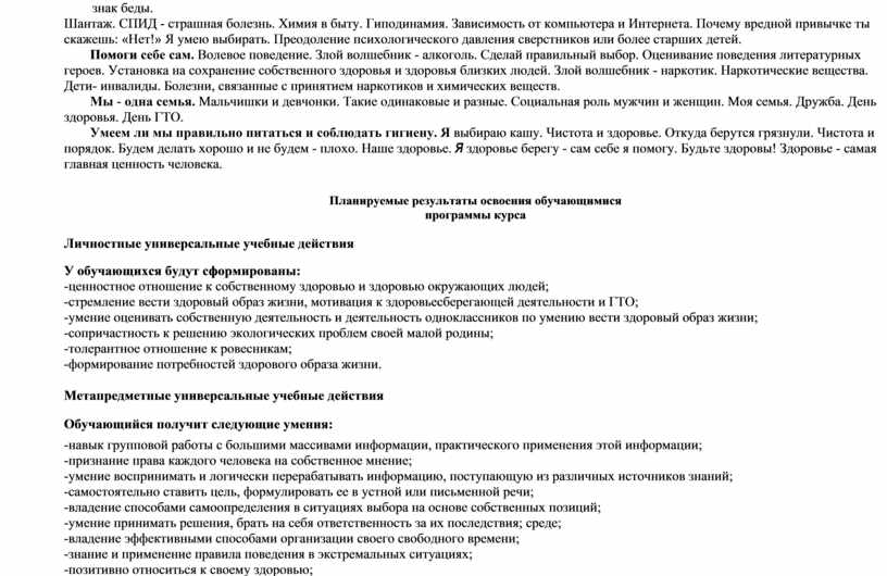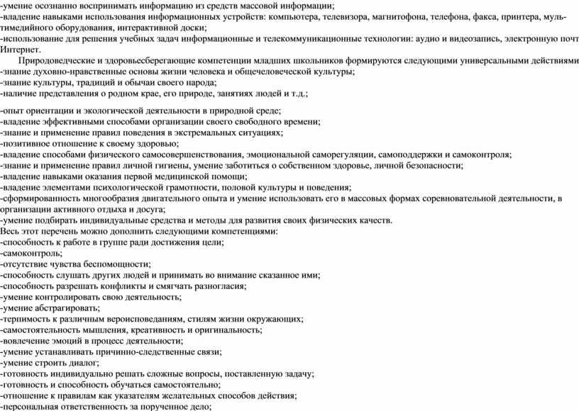 Ценностно-смысловые компетенции по здоровьесберегающему направлению предполагают наличие сформированных у младших школьников универсальных учебных действий: