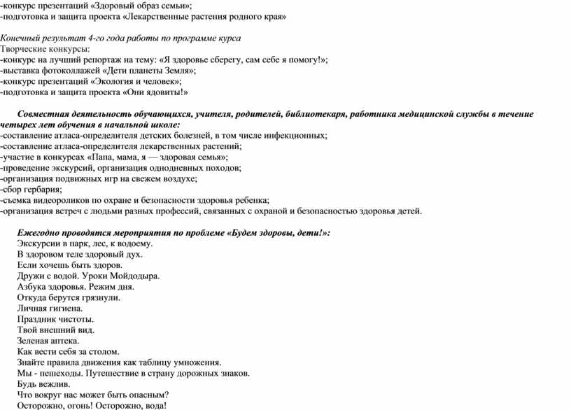 Программа охватывает основные направления здоровьесберегающей деятельности в начальной школе и позволяет пробуждать в детях желания заботиться о своем здоровье, относиться к своему здоровью как к ценности; формировать установки на использование здорового питания; издавать оптимальные двигательные режимы для детей с учетом из возрастных, психологических и иных особенностей, развивать потребности I занятиях физической культурой и спортом; соблюдать рекомендуемый врачами режим дня; снизить влияния негативных факторов и рисков на здоровье детей (низкая двигательная активность, курение, алкоголь, наркотики и другие психоактивные вещества, инфекционные заболевания);