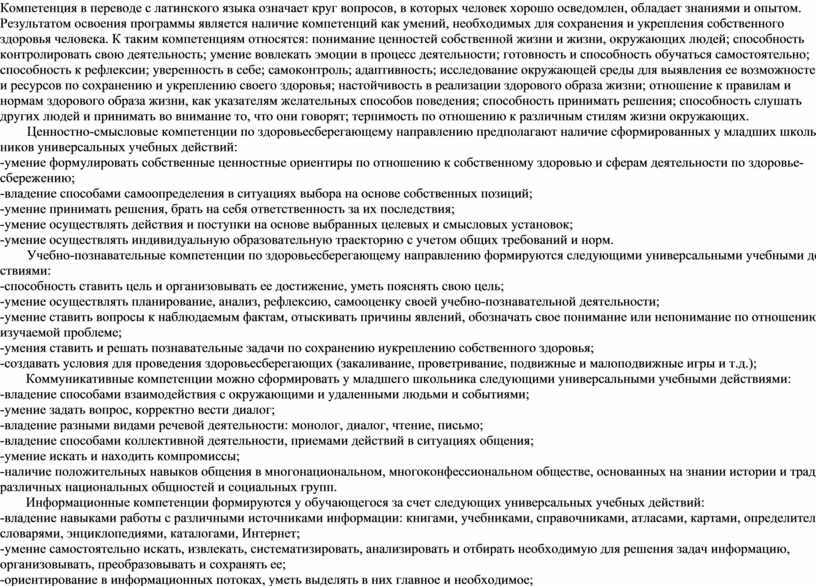 Компетенция в переводе с латинского языка означает круг вопросов, в которых человек хорошо осведомлен, обладает знаниями и опытом. Результатом освоения программы является наличие компетенций как умений, необходимых для сохранения и укрепления собственного здоровья человека. К таким компетенциям относятся: понимание ценностей собственной жизни и жизни, окружающих людей; способность контролировать свою деятельность; умение вовлекать эмоции в процесс деятельности; готовность и способность обучаться самостоятельно; способность к рефлексии; уверенность в себе; самоконтроль; адаптивность; исследование окружающей среды для выявления ее возможностей и ресурсов по сохранению и укреплению своего здоровья; настойчивость в реализации здорового образа жизни; отношение к правилам и нормам здорового образа жизни, как указателям желательных способов поведения; способность принимать решения; способность слушать других людей и принимать во внимание то, что они говорят; терпимость по отношению к различным стилям жизни окружающих.