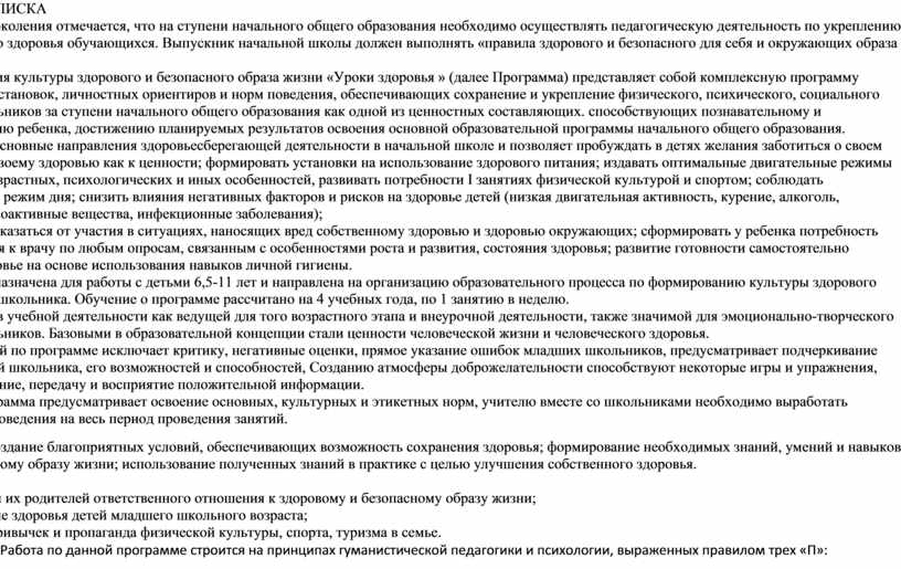 Программа формирования культуры здорового и безопасного образа жизни «Уроки здоровья » (далее Программа) представляет собой комплексную программу формирования знаний, установок, личностных ориентиров и норм поведения, обеспечивающих сохранение и укрепление физического, психического, социального здоровья младших школьников за ступени начального общего образования как одной из ценностных составляющих. способствующих познавательному и эмоциональному развитию ребенка, достижению планируемых результатов освоения основной образовательной программы начального общего образования.